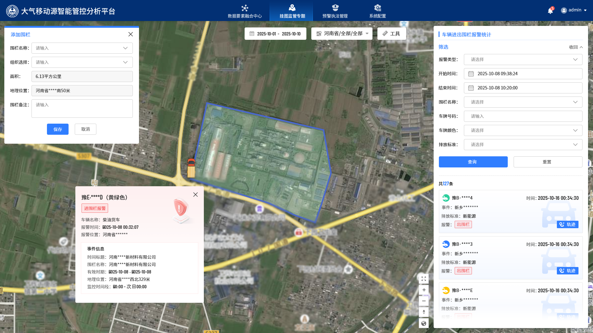 针对禁限行区、重点企业、敏感站点等重点区域,平台支持灵活划定电子围栏,并可分时段、分车型设置差异化报警规则。一旦有本地或外地牌照的黑名单车辆闯入或国五车辆违规通行,系统自动实时报警,精准支撑管控政策落地评估,实现“空间定界、责任到车”。