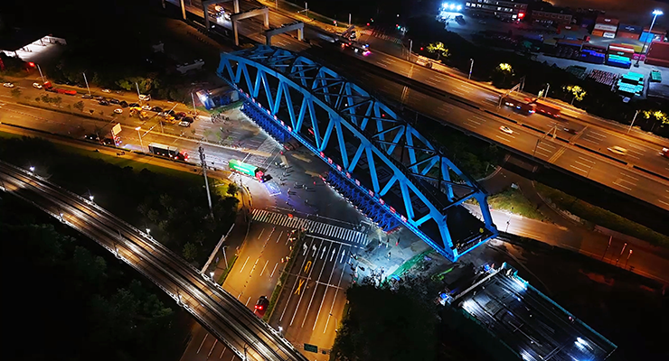 这座“跨度之最”的钢桁梁采用双主桁结构,梁长154.8米,宽21.28米,用钢量4996吨,总重约5600吨。作为全线控制性工程,桥梁跨越斜穿交通极为繁忙的杨高北路与港城路交叉十字路口,日均车流量高达5.36万辆,地下密布176条管线,最近处距离机场输油管道仅6米,钢梁移运堪称“在刀尖上跳舞”。